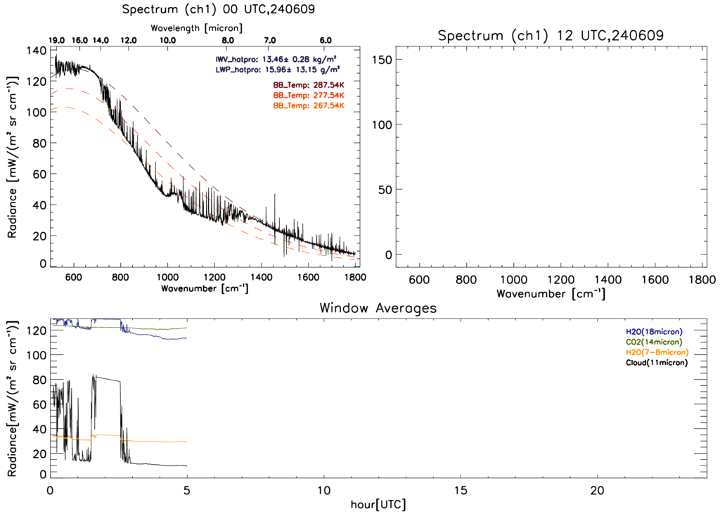 The AERI is an operational infrared spectrometer that measures the downwelling infrared radiance from 3.3-19 µm at 1 cm-1 resolution. Like the microwave spectrum, the infrared spectrum also contains information on the vertical profile of temperature and humidity. Spectral observations from 612-713 cm-1 and 2223-2260 cm-1 (i.e., measurements from the 15 µm and 4.3 µm CO2 bands, respectively) are used for temperature profiling, and observations from 538-588 cm-1 and 1250-1350 cm-1 (i.e., measurements from the wings of the rotational and 6.3 µm water vapor bands, respectively) for water vapor profiling. Additionally, selected window channels provide information on low-LWP (< 50 gm-2) liquid water cloud effective radius and cloud optical depth as well as ice clouds and aerosol. Currently, our AERI is also used for columnar trace gas retrieval (CO2, CH4, N2O).