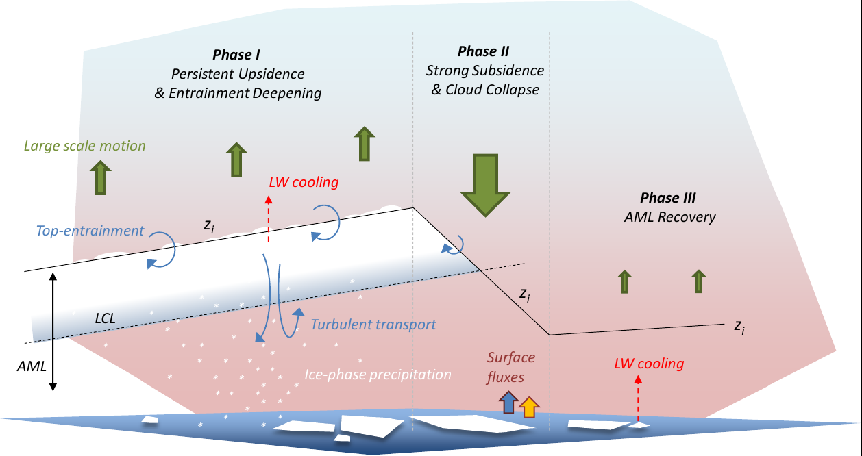 Cold air outbreaks (CAOs) in the Arctic are situations in which a low level mass of cold air initially situated over the sea ice is advected across the ice edge and continues over open water. This process is accompanied by the formation of a convective boundary layer that deepens rapidly, featuring strong surface heat fluxes as well as the formation of low-level mixed-phase clouds. The dynamics in the CAO boundary layer are often complex, as illustrated in Fig. 2. Often these clouds are organized into streets, which at some point downstream of the ice edge tend to break up into bigger individual cells. These cells, often arranged into a spoke-pattern, can appear as either open cells (with a cloud free center) or as closed cells. Recent research has suggested that microphysical processes play an important role in determining the eventual cloudiness in the cell centers.