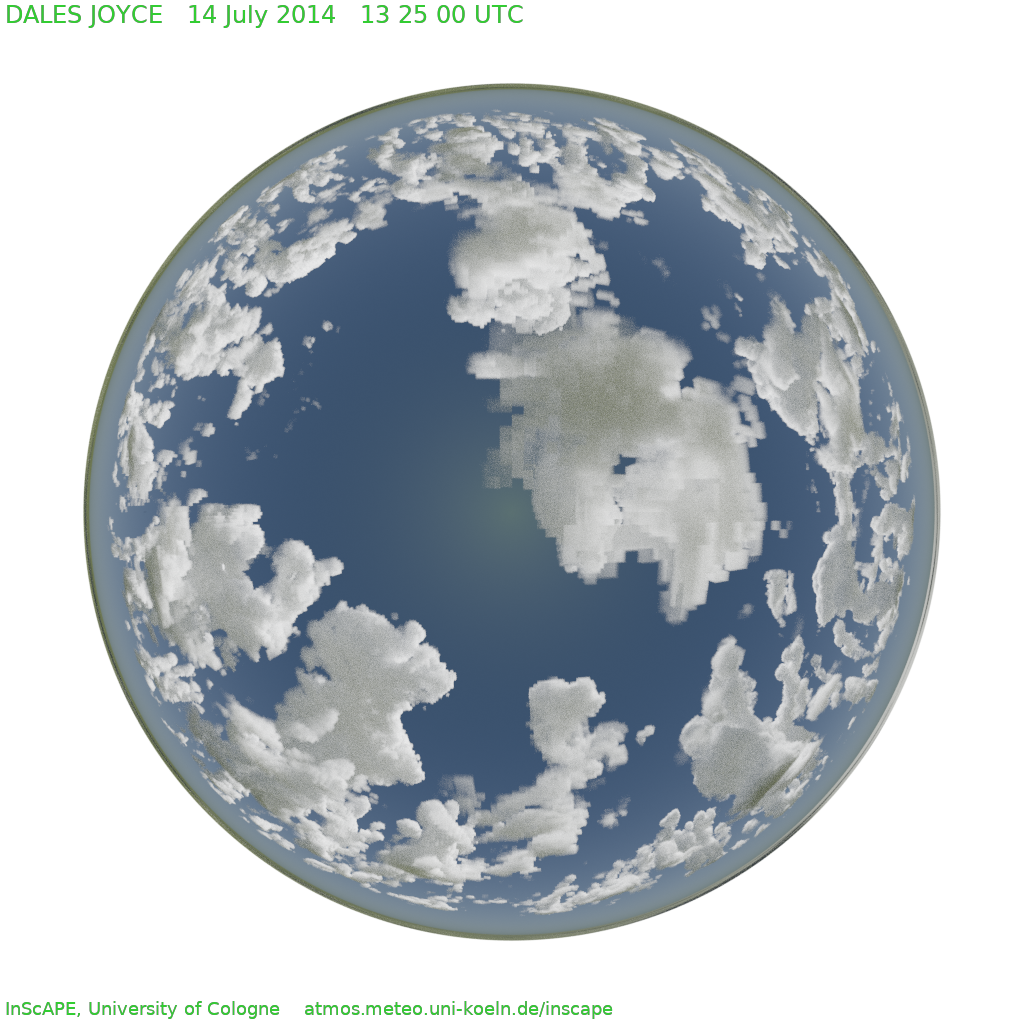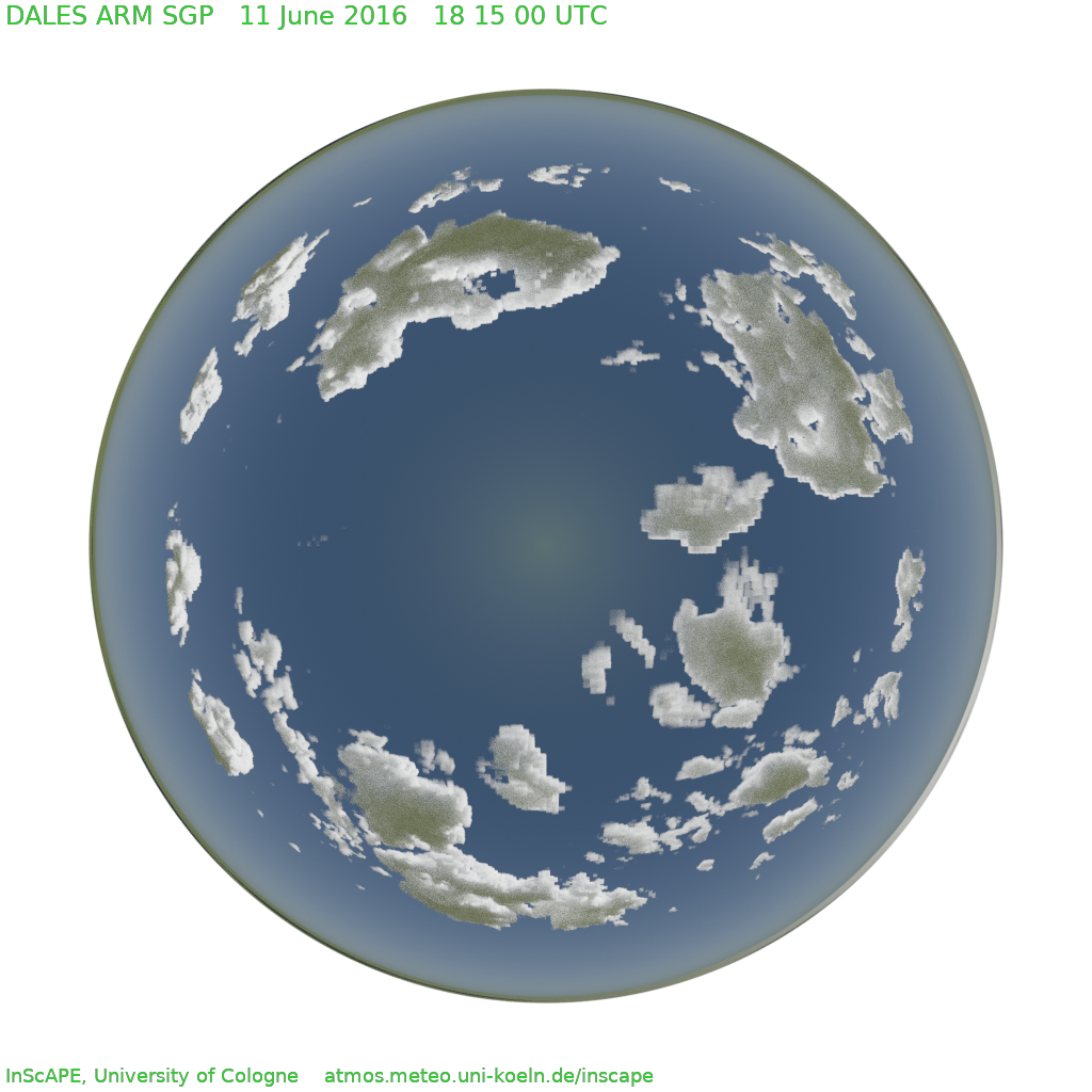 We make use of Blender and its path-tracing engine to realistically render three-dimensional cloud fields from Large-Eddy Simulations (LES). These are not just for show, but can also be used as “instrument simulators”, mimicking the way visual instruments like Total Sky Imagers (TSI) or other hemispheric cameras view the world. This allows a fair comparison between model and measurements.